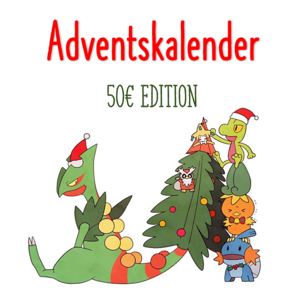 Hier erhaltet ihr einen individualisierten Adventskalender voll mit Pokémon Stuff! Euch wird ein Paket mit 24 fertigen, durchnummerierten, weihnachtlichen Tüten zugeschickt. Der Inhalt aller 24 Türchen hat zusammen einen garantierten Warenwert von mind. 45€ (5€ werden für die Verpackung und für die Nummern Sticker gebraucht). Auf Wunsch könnt ihr im Nachhinein auch die Auflistung des Inhalts mit berücksichtigten Warenwerten auf Anfrage erhalten.